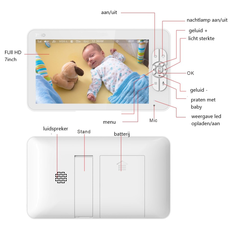Mooi groot en duidelijk scherm. Handige bedieningsknop om de camera van richting te veranderen. Is zeer gebruiksvriendelijk. Is de 1e babyfoon die echt ver gaat in onze lange tuin en nog signaal geeft en geloof me ik heb er al veel getest.